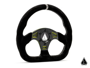 This steering wheel features a fierce design to match your machine. It has a CNC cut aluminum plate with the options of 5 different colored lower plates for added style. And it's finished in jet-black suede material.